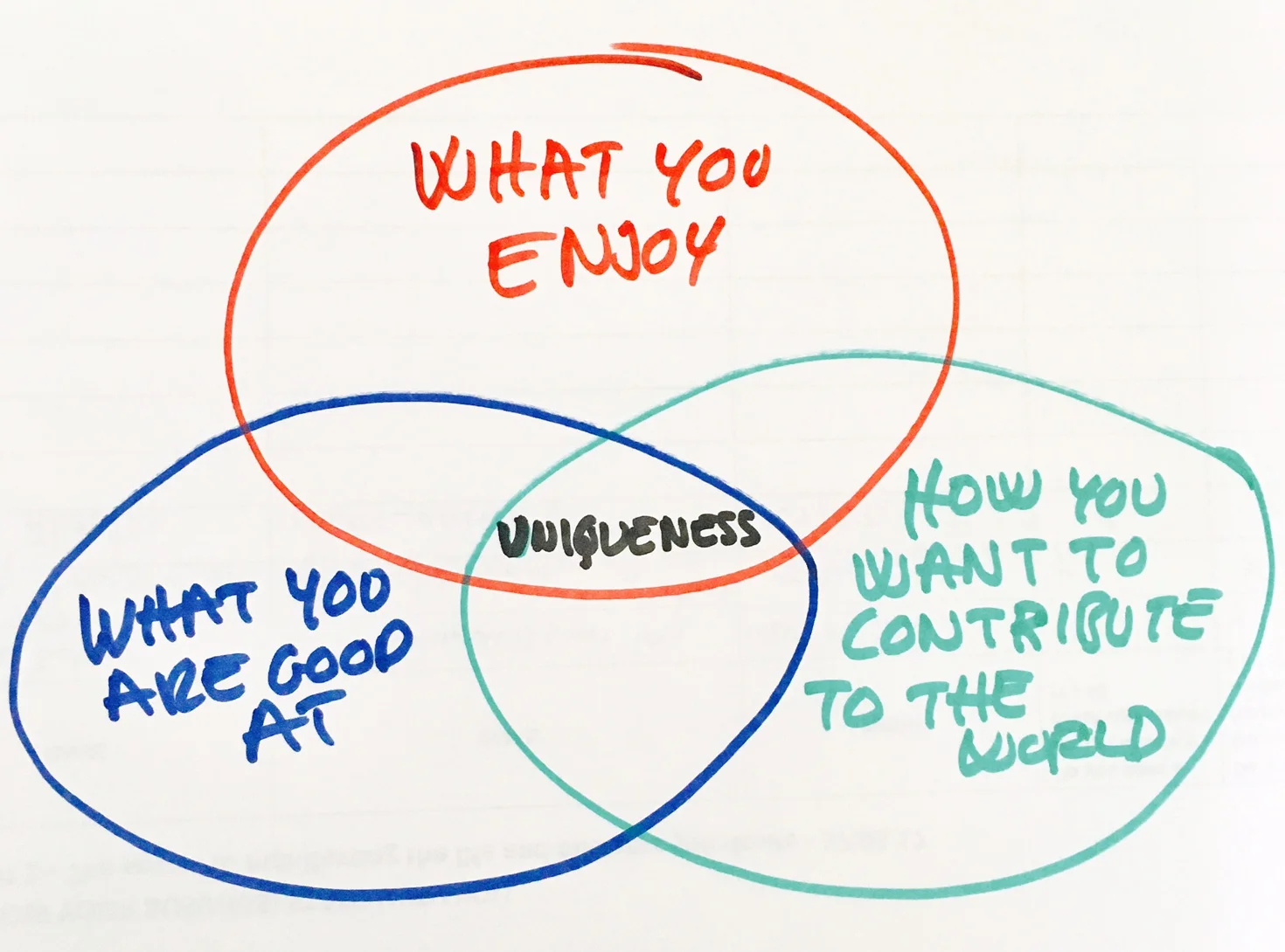 The next few years after that, which in the end led me to train as a coach, were a search for something more. I read a lot about how to find the right career through that period, and I’m going to share with you now what I think was the most useful model I found. It was a Venn diagram, which I think I took from a webinar with Brett Thomas, although there are other similar ones out there. It said that your ‘calling’ is the overlapping point of three circles: What You Are Good At, What You Enjoy, and How You Want to Contribute to the World.